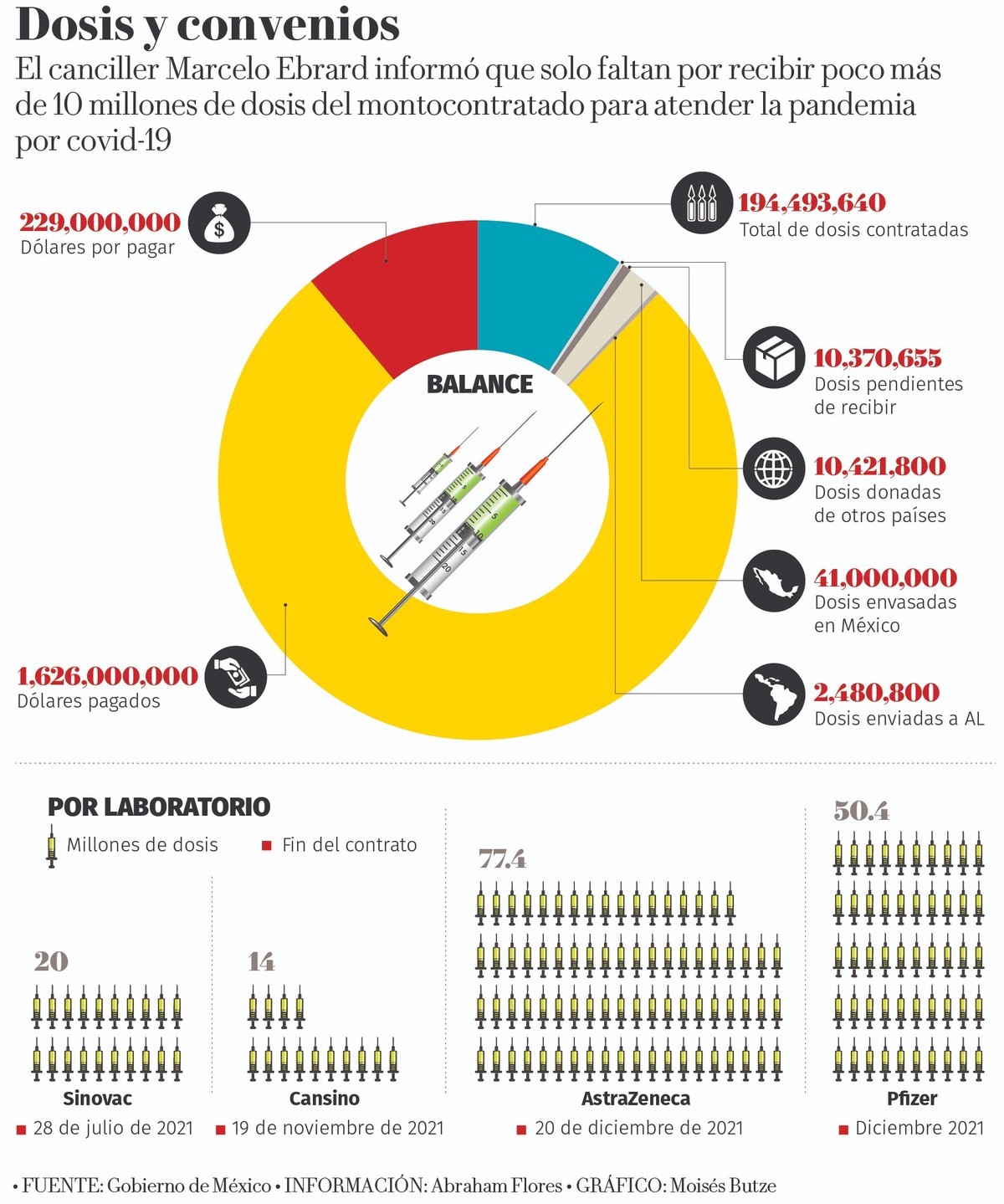 Detalló que a la fecha se han recibido 184 millones 147 mil 825 dosis por contrato, recibió por donación 10 millones 421 mil 800 dosis y donó a otros países de América Latina 2 millones 480 mil 800 dosis. De esta manera, solo quedan pendientes de recibirse las 10.3 millones que informó el canciller.