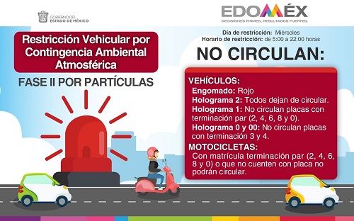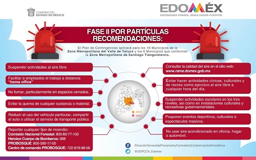 La Secretaría del Medio Ambiente, a través de la Dirección General de Prevención y Control de la Contaminación Atmosférica, informa que se activan acciones en Fase II de Contingencia Ambiental Atmosférica por partículas en las Zonas Metropolitanas del Valle de Toluca y Santiago Tianguistenco.