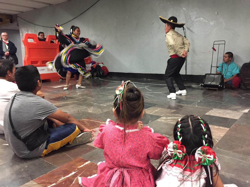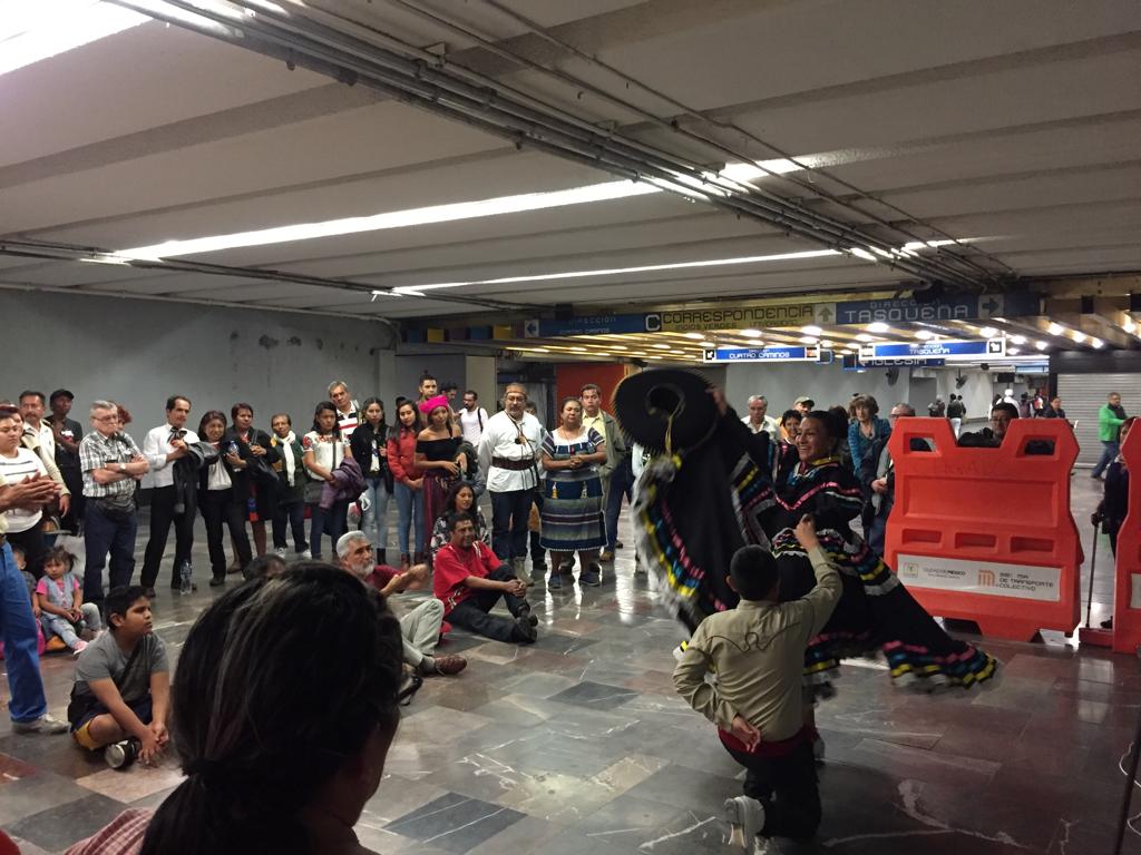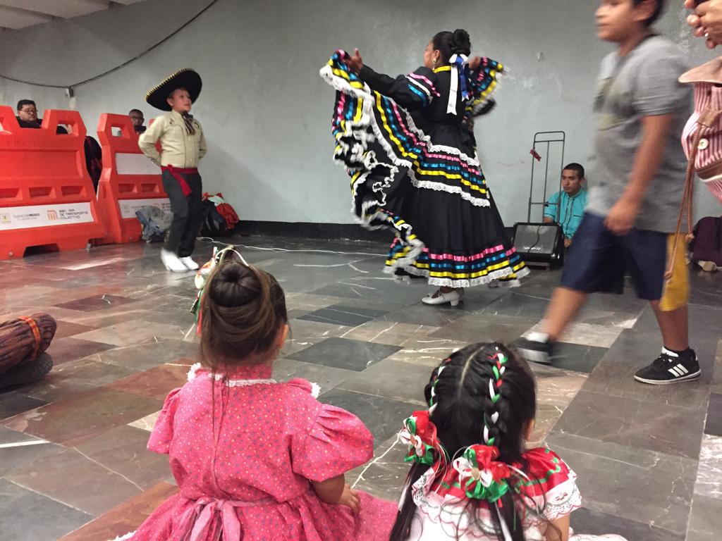 De cara a las celebraciones de esta noche, el grupo Flor de México, de la Casa de Cultura de Cd. Neza, pone el ambiente en la estación del Metro Hidalgo.