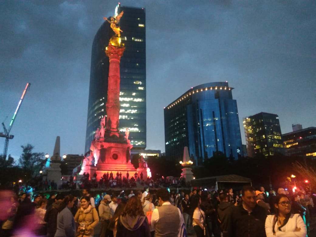 Las celebraciones por la Independencia de México también se realizan en la columna del Ángel, donde cientos de mexicanos se han dado cita.