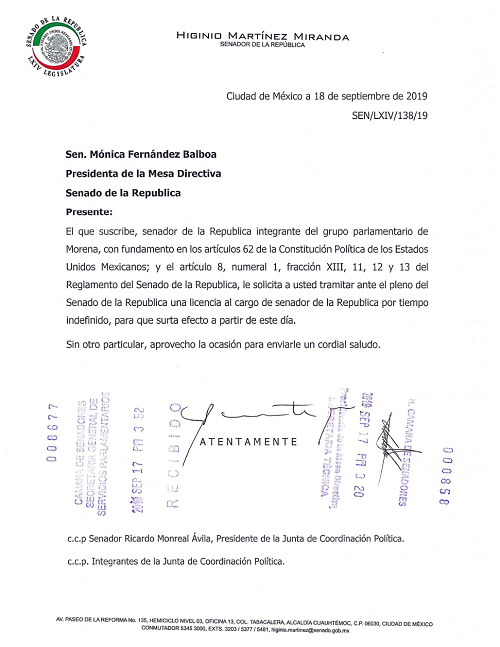 El Senado de la República aprobó al morenista Higinio Martínez Miranda, una licencia para separarse del cargo de manera indefinida, por lo cual su lugar será ocupado por Ricardo Moreno Bastida, quien a su vez deja la función de secretario del Ayuntamiento de Toluca a Francisco Vázquez.