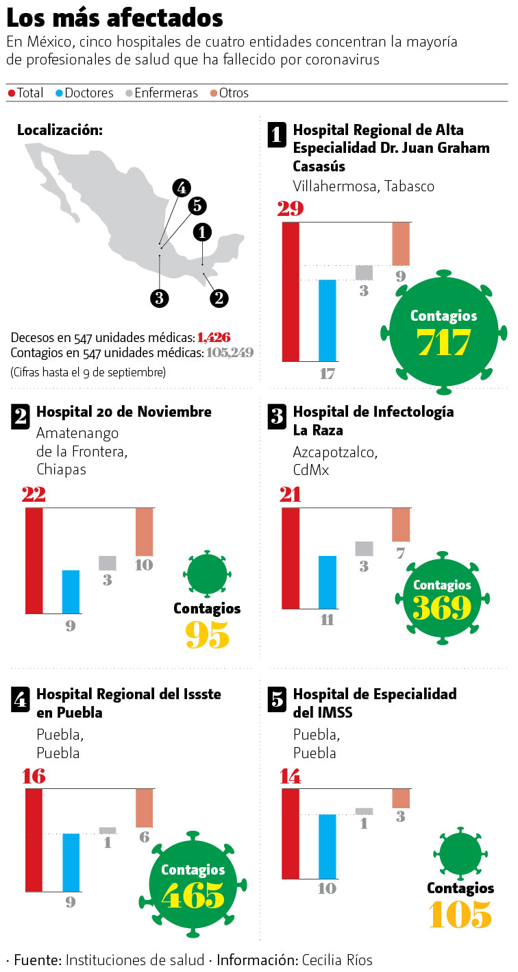 A principios de septiembre, la Ssa reportó el contagio de mil 426 profesionales de la salud y la defunción de 707 médicos, 261 enfermeras y enfermeros, 30 laboratoristas y 428 trabajadores de las instituciones sanitarias.