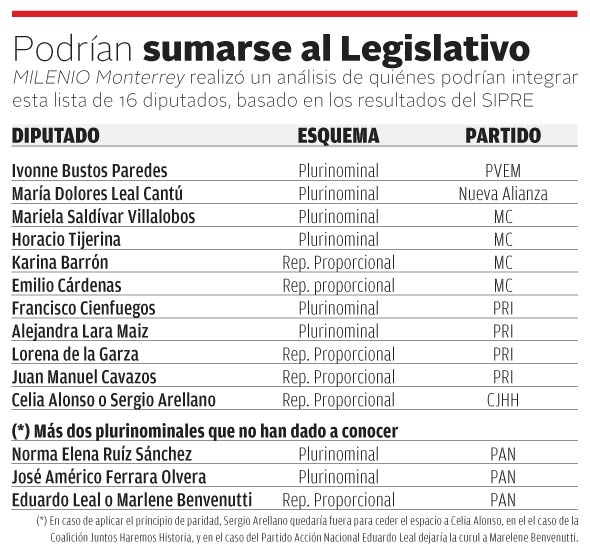MILENIO Monterrey realizó un análisis de quiénes podrían integrar esta lista de 16 legisladores, basado en la información arrojada por el Sistema de Resultados Preliminares (SIPRE), sin embargo, se aclara que esta lista podría variar, de acuerdo con los resultados finales del cómputo.