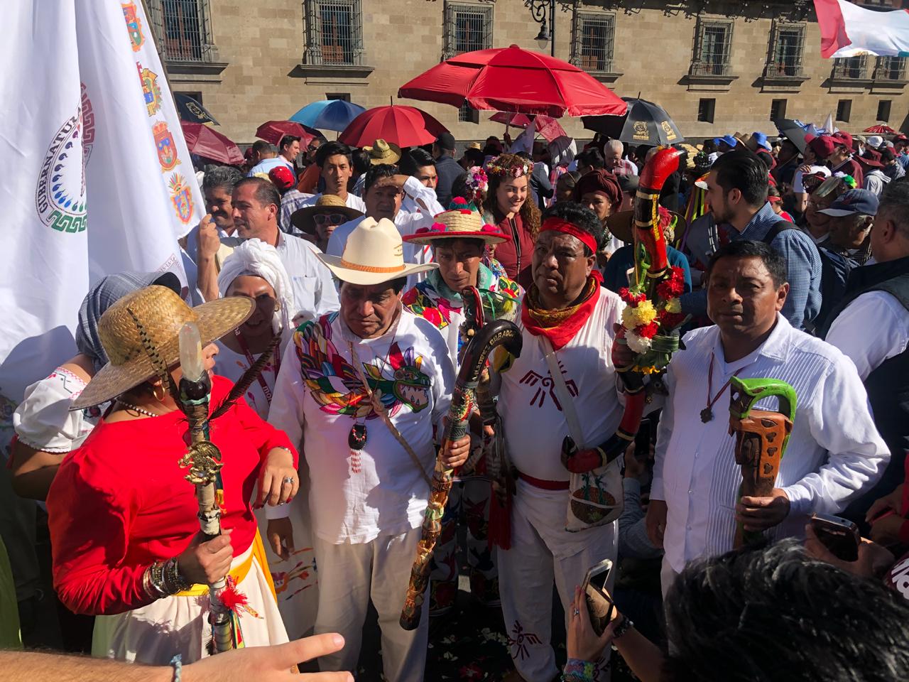 Los integrantes del grupo llegaron al Zócalo vestidos con los trajes típicos de sus lugares de origen y realizaron la ceremonia con palomas blancas, hierbas sagradas y un circulo de flores en el que dieron la bendición al Bastón de mando que esperan entregarle al Presidente a su llegada.