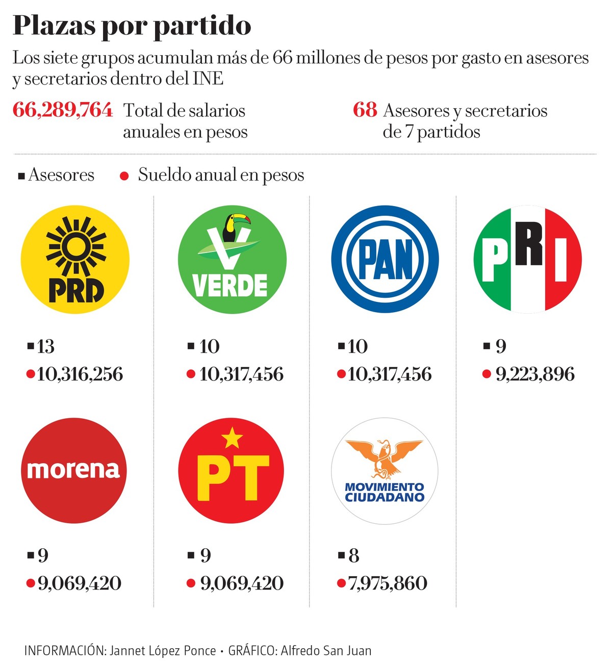 Este año, los siete partidos políticos nacionales cargaron al presupuesto del Instituto Nacional Electoral más de 66 millones de pesos en sueldos para 68 asesores y secretarios que les asisten y orientan dentro del Consejo General del INE, lo que la autoridad electoral debió pagar de manera adicional a los más de siete mil millones de pesos que repartieron en prerrogativas.