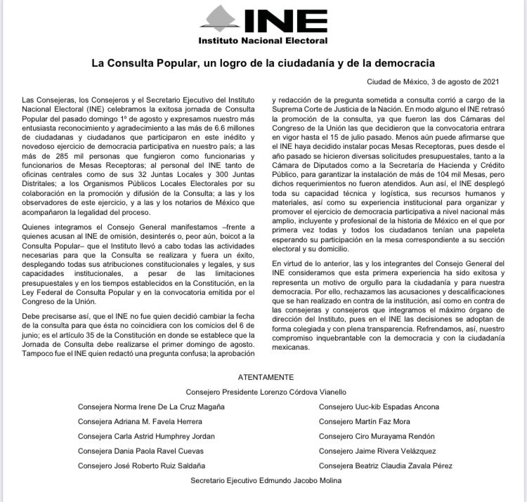 Los 11 consejeros y consejeras electorales, junto al secretario Ejecutivo del Consejo General, firmaron un desplegado en el que sostienen que la consulta fue una jornada exitosa, pues el INE cumplió con sus atribuciones legales y constitucionales.