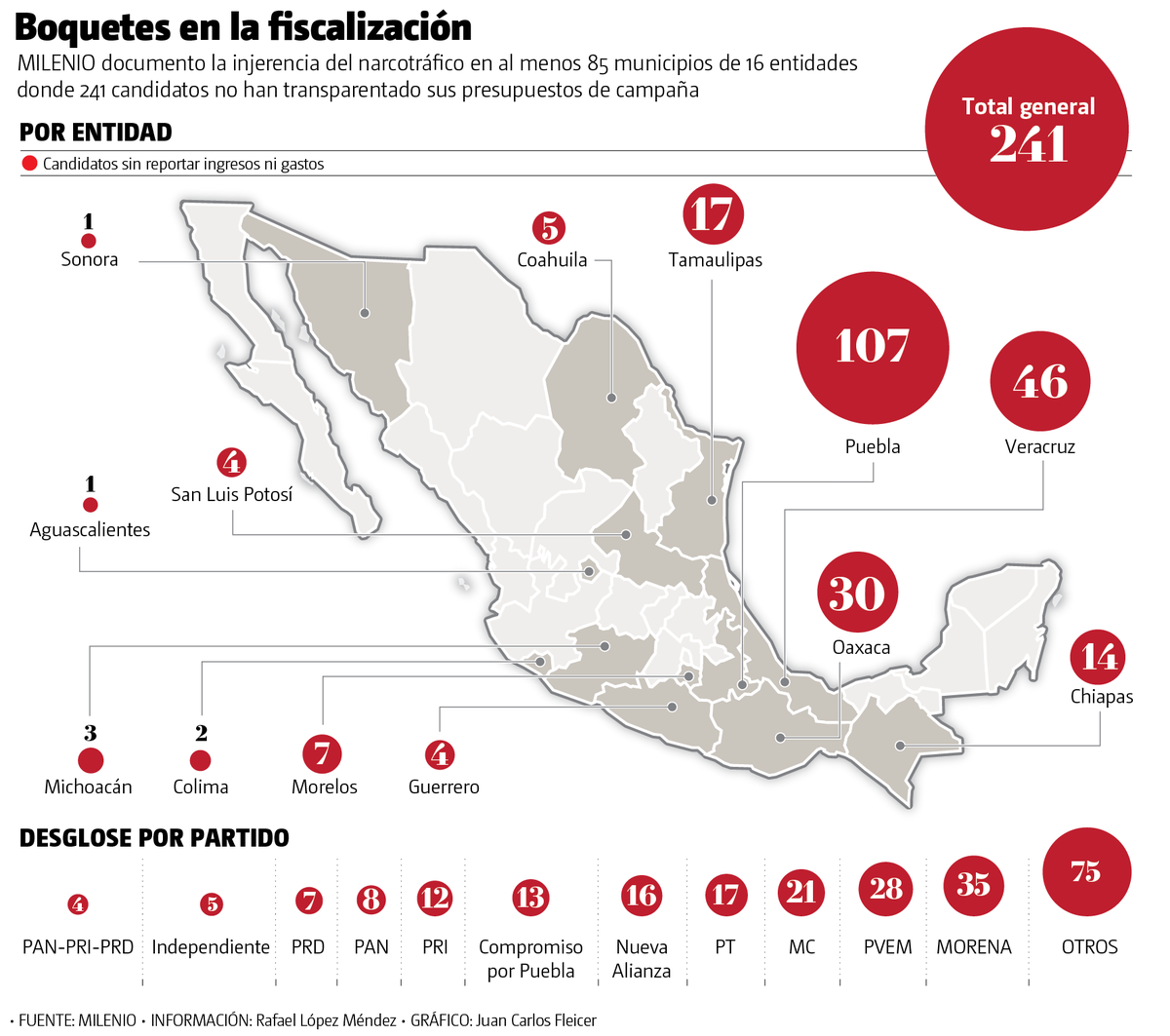 Sobre esa línea, los municipios de Puebla que registran una fuerte presencia de grupos armados dedicados al robo de combustible representan el mayor boquete en materia de fiscalización para el INE, ya que solo 22 de 129 candidatos para alcalde han reportado ingresos o gastos de campaña durante el actual proceso electoral.