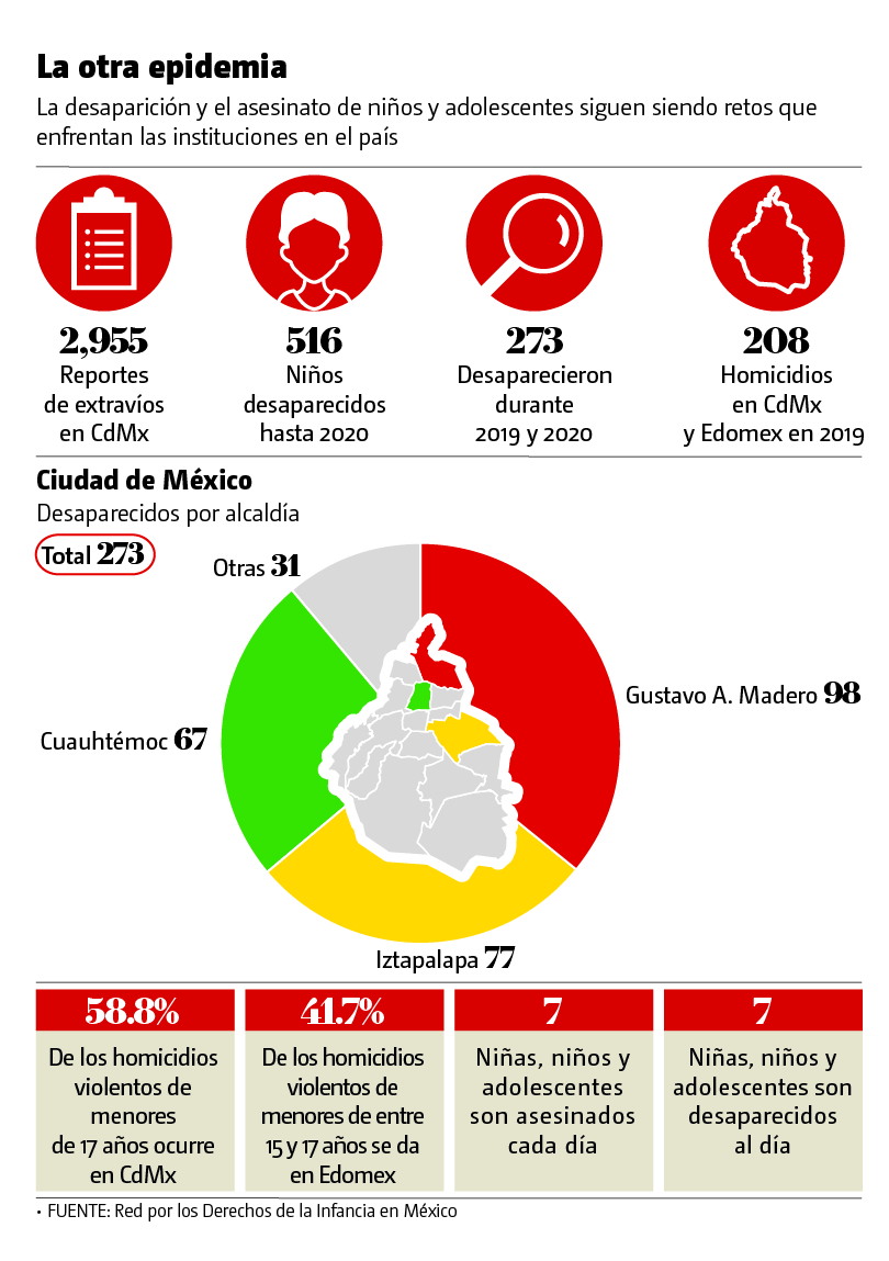 En 2019 asesinaron a 34 niños y niñas en Ciudad de México; en el Estado de México fueron 164. En cuanto a desapariciones, en la capital de país hay un acumulado de 273 entre 2019 y 2020, principalmente adolescentes.