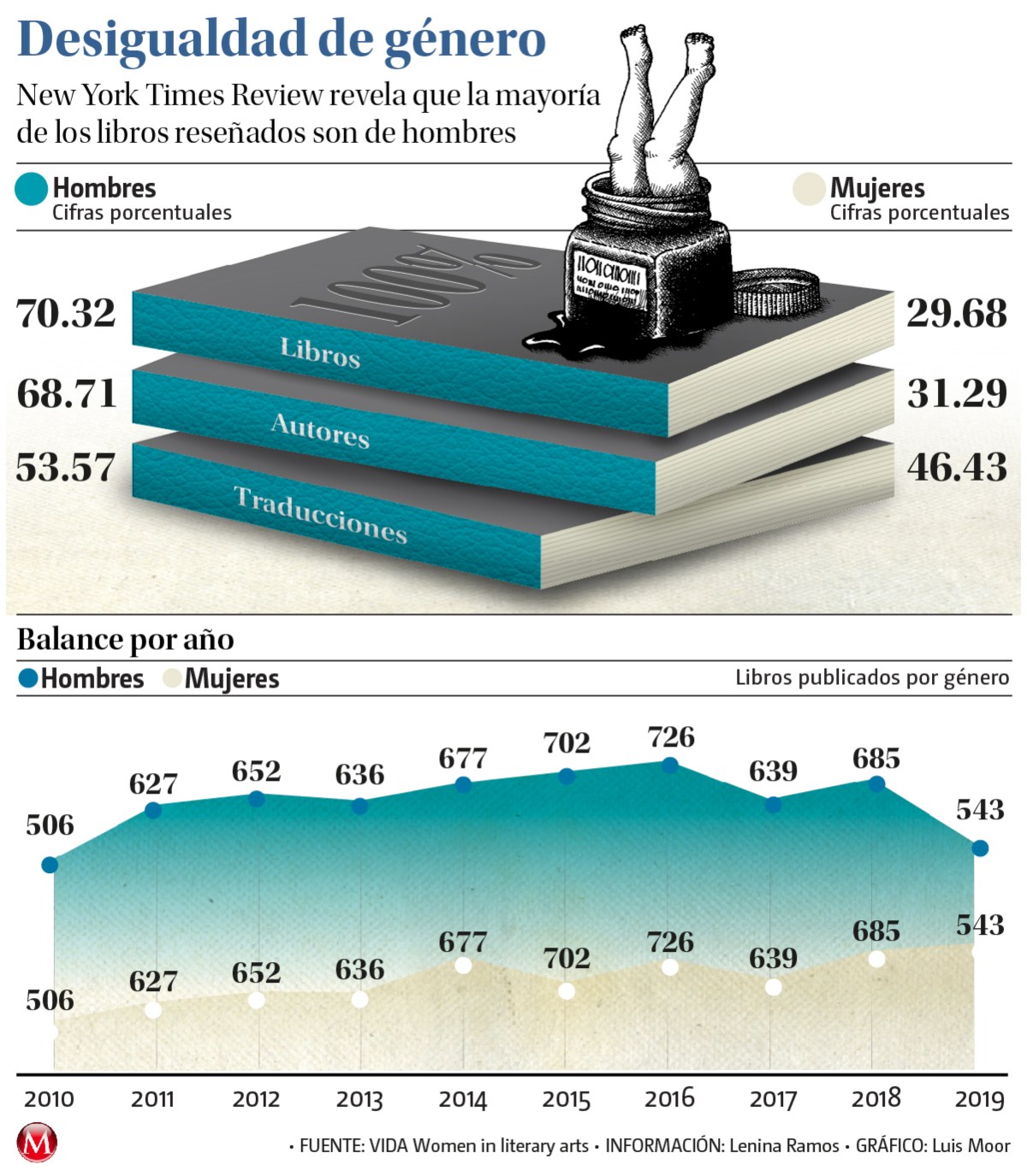 Se conocen cifras a través de los estudios de VIDA. Cuántos libros de mujeres han sido reseñados o cuántos premios han ganado, entre otras cosas. Cuando ves la gráfica, por ejemplo, del New York Times Book Review, resulta que 80 por ciento de los libros reseñados son de hombres. Otros datos más sutiles arrojan que el libro de una mujer casi siempre es reseñado por una mujer, pues existe el prejuicio de que los hombres no quieren reseñarlos. Ya se estudió que, casi siempre, cuando una mujer gana un premio de novela, su protagonista es un hombre. Eso es impactante porque entonces resulta que las historias de los hombres son más profundas, más universales y, por tanto, son premiadas. Otra cosa que han encontrado es que casi siempre la literatura de una mujer es comparada con la de otra mujer, es raro que comparen a una mujer con un hombre. Son cosas que suceden inconscientemente. Sabemos que los resultados que van a publicarse no serán muy favorables, en unos países más, en otros menos.