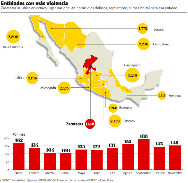 Zacatecas registró al menos seis ataques, con un saldo ocho muertos, entre ellos un joven de 17 años que jugaba con su patineta en la colonia Esparza, en Fresnillo, y dos hombres, en Enrique Estrada.