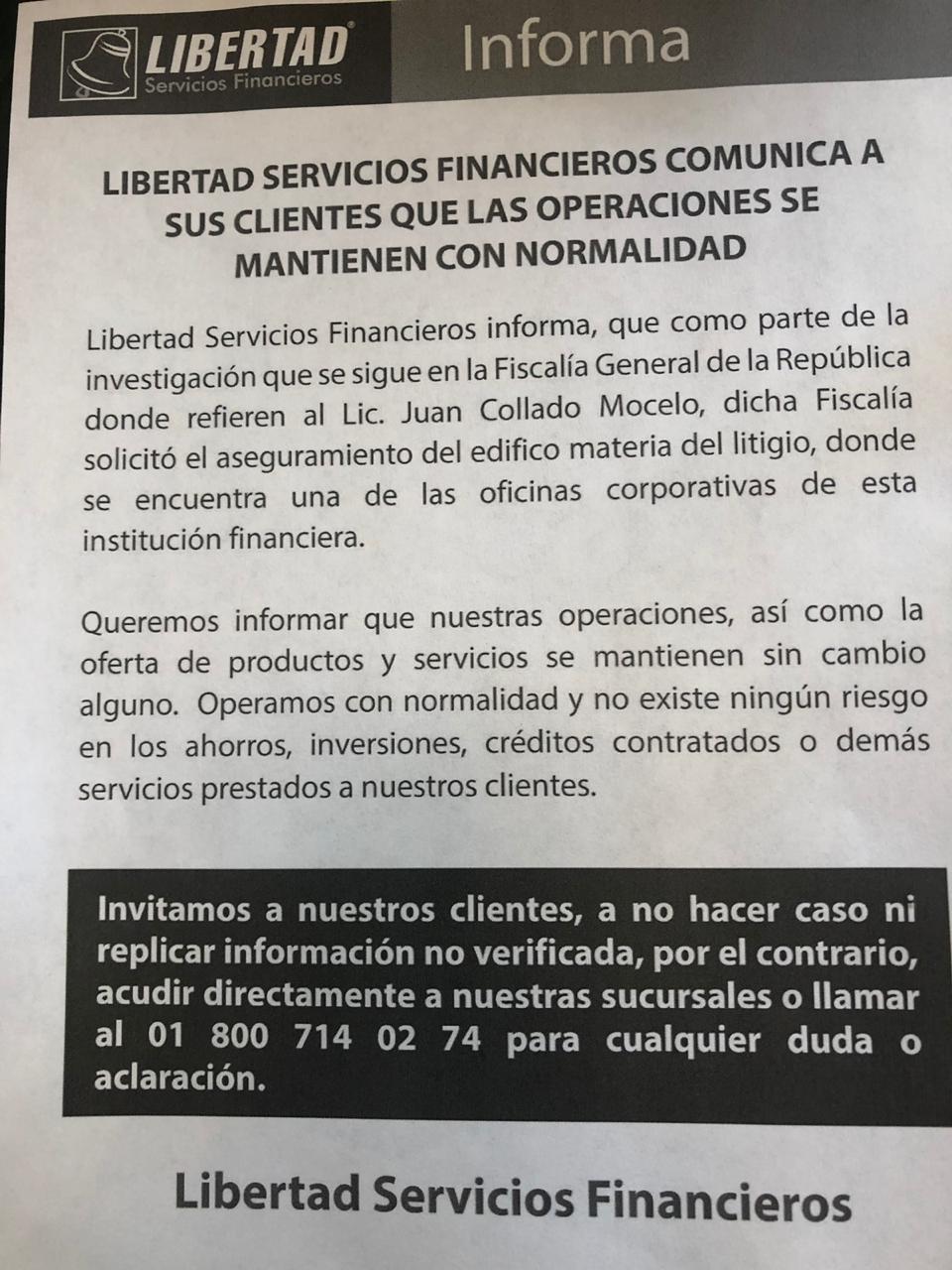 Libertad Servicios Financieros informó que la Fiscalía General de la República (FGR) solicitó el aseguramiento del corporativo de la empresa debido a la investigación que se sigue contra el abogado Juan Collado.