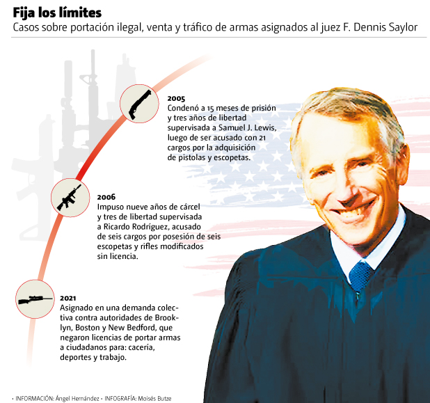 El juez que analizará la demanda mexicana contra los fabricantes de armas más importantes de EU, F. Dennis Saylor, de Massachusetts, es cercano al Partido Republicano, pero ha dejado claro en sus fallos que la Segunda Enmienda de la Constitución estadunidense no implica derechos ilimitados para su portación.