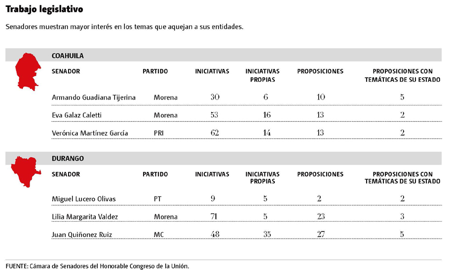 A diferencia de sus homólogos en la Cámara de Diputados, los legisladores del Senado de la República, que representan tanto a Coahuila como a Durango, muestran mayor interés en los temas que aquejan a sus entidades, pero aún así la agenda de sus bancadas le gana a eso.