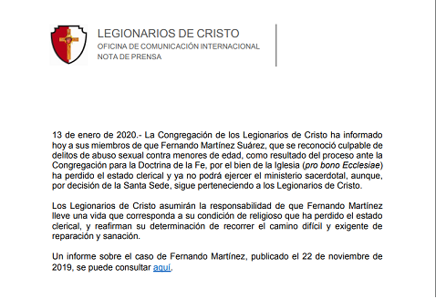 "Ante el resultado de las investigaciones sobre el caso del P. Martínez, nos provoca profundo dolor el sufrimiento de las víctimas y el escándalo causado. Junto con el P. Martínez pedimos humildemente perdón por sus actos abusivos contra menores de edad y deploramos nuestros errores que han aumentado todavía más el dolor de las víctimas."Como institución también pedimos perdón al P. Martínez por los abusos que él sufrió y por no haberle ayudado adecuadamente cuando salieron a la luz los abusos que él había cometido", dice el documento.
