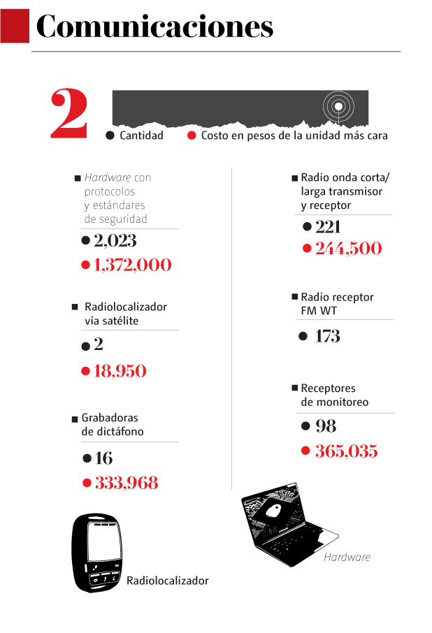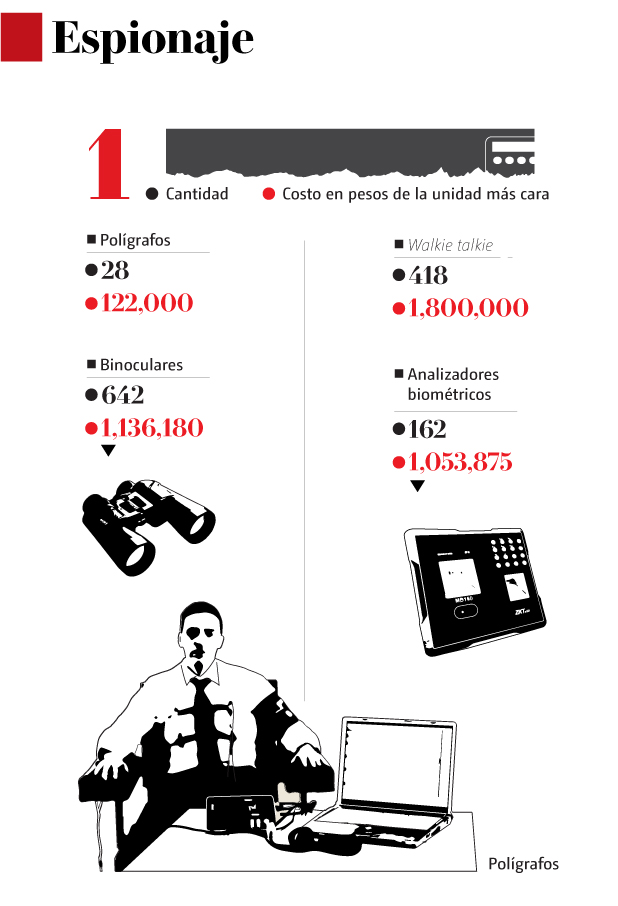 Además, entre los 28 polígrafos portátiles, algunos valen 122 mil y otros 135 pesos. El walkie-talkie más caro tiene un precio de un millón 800 mil pesos.