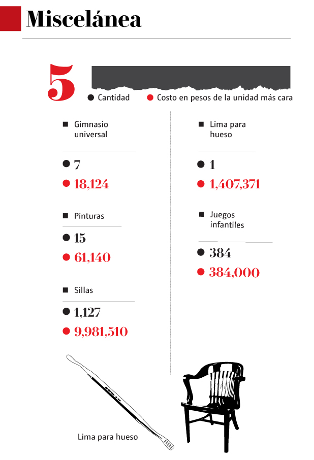 La Secretaría de Gobernación también tiene registradas 30 sillas para bebés, la más onerosa con un valor de 185 mil pesos, tres resbaladillas, tres columpios, tres cunas y 384 casas del árbol para niños, estas últimas con un precio de 384 mil pesos.