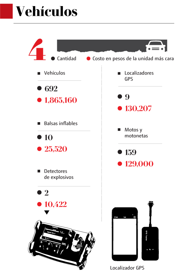 Para el traslado de su personal, la secretaría cuenta con 692 automóviles (el más caro es de un millón 865 mil pesos), tres vehículos para 30 pasajeros cada uno, 300 camiones de diversos tipos, nueve casas remolque, cinco autobuses de turismo, 23 microbuses, 159 motos y motonetas, 48 vagonetas, 417 camionetas, 80 Jeeps y tres Suburban 4x4 blindadas, que tienen un valor de 130 mil 207 pesos.