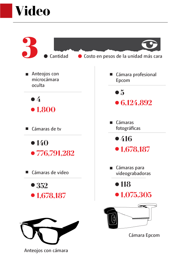 Hay ocho cámaras submarinas, 140 de televisión y hasta dos camiones con unidades de TV. Para que el audio sea perfecto, la dependencia cuenta con 106 bafles que van de los 3 millones a los 121 pesos, así como mil 633 tipos de micrófonos, que valen entre 10 millones y 331 pesos.