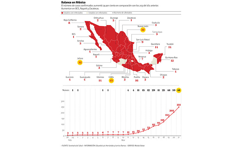 De los 251 casos confirmados hasta el último reporte, 48 son nuevos; además, se registran 697 casos sospechosos, mientras mil 463 casos dieron negativo; en tanto, la cifra de defunción se mantiene en dos casos, 1 por ciento del total; 14 por ciento ya se encuentran recuperados, es decir, 34 pacientes y 85 por ciento se mantiene en aislamiento: 215 personas.