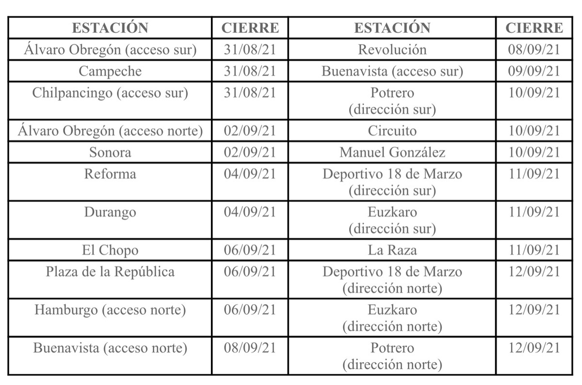 En el caso de los trabajos en las estaciones Glorieta Insurgentes (dirección norte y sur), Buenavista II y la terminal Indios Verdes se realizarán sin afectar el servicio por lo que no será necesario el cierre de las estaciones.