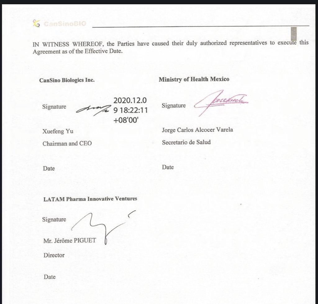 Enhorabuena al Dr Jorge Alcocer, Secretario de Salud, a Xuefeng Yu, Presidente de CanSino Biologics Inc. y a Jerome Piguet de LATAM PHARMA por el acuerdo de precompra de 35 millones de dosis de vacunas firmado hoy. Más opciones para México. pic.twitter.com/MiIilW9IeT