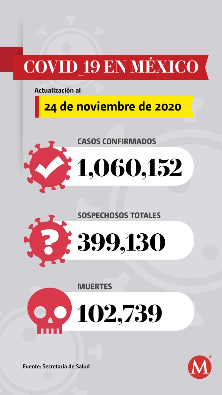 En México se han confirmado un millón 60 mil 152 de casos de coronavirus, de los cuales han fallecido 102 mil 739 pacientes, informó la Secretaría de Salud este martes 24 de noviembre.