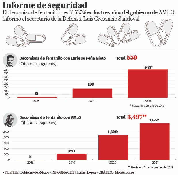 Las cifras oficiales muestran que los decomisos de esta sustancia crecieron 458 por ciento de 2019 a 2021, al pasar de 525 kilos en el periodo 2016-2018 a dos mil 932 en este gobierno.