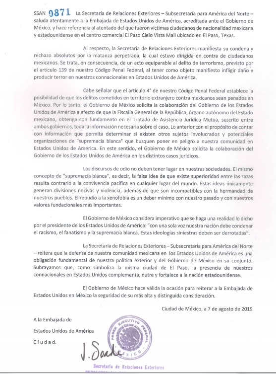 Cuatro días después de la masacre en el centro comercial Cielo Vista, la SRE difundió la nota diplomática que entregó a la embajada de Estados Unidos para fijar su postura de condena por el tiroteo en donde ocho mexicanos perdieron la vida.