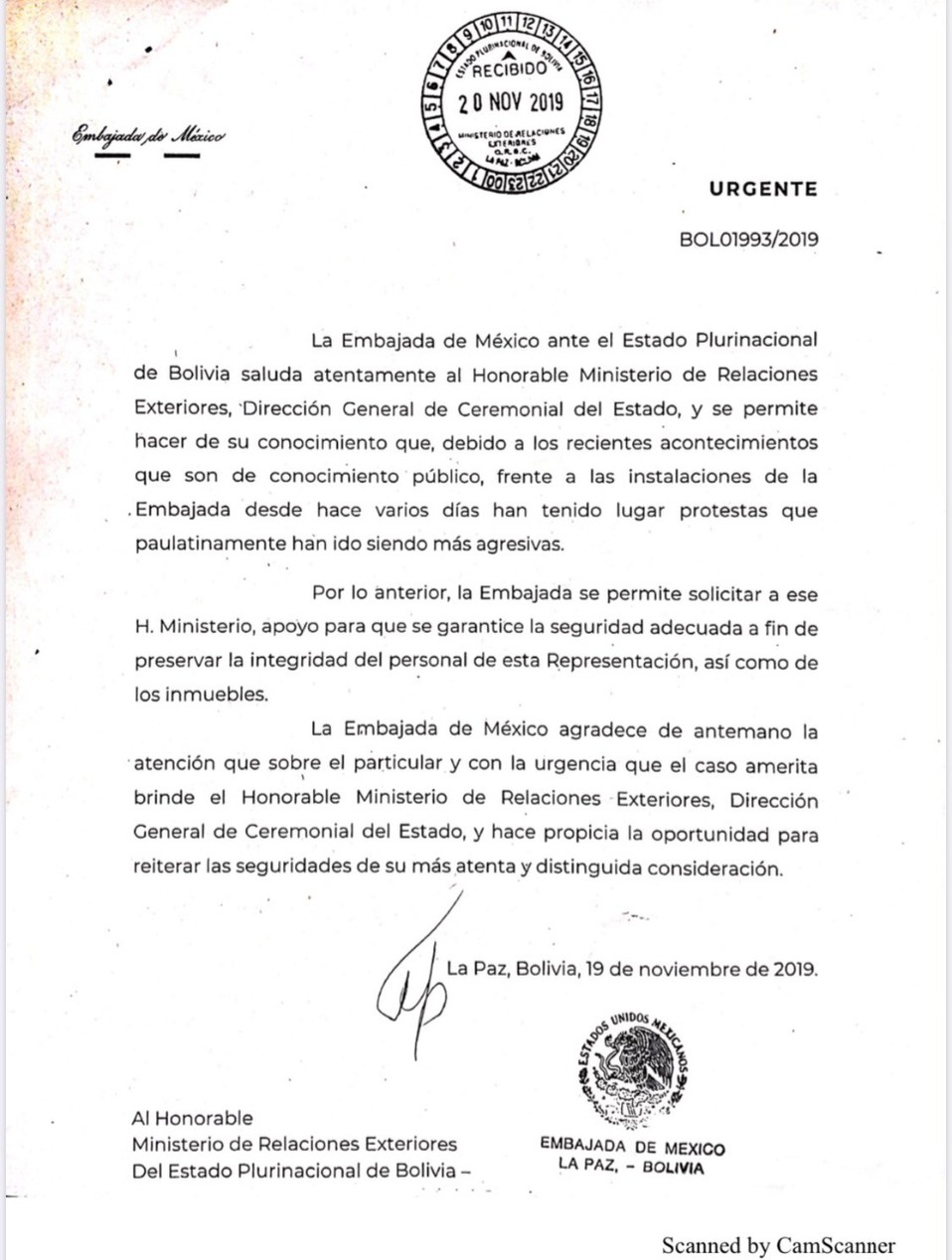 La embajada de México solicitó hace un mes a las autoridades de Bolivia apoyo de las fuerzas policiales de ese país para resguardar la seguridad de la sede diplomática luego de las violentas protestas que se dieron en territorio boliviano.