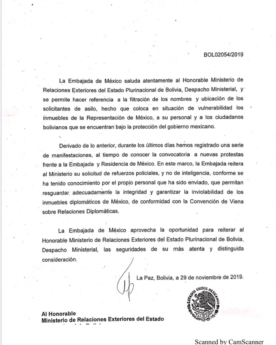 De igual manera, destaca la filtración los nombres de ex funcionarios bolivianos asilados, lo cual, pone en riesgo al inmueble, al personal y a los ciudadanos que se encuentran bajo la protección del gobierno de México en ese país.