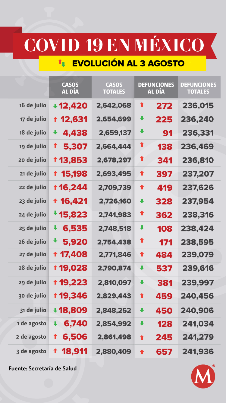 México registra 18 mil 911 nuevos casos y 657 nuevas muertes de coronavirus en las últimas 24 horas, con lo que acumulan un total de dos millones 880 mil 409 contagios y 241 mil 936 defunciones, de acuerdo con el informe de la Secretaría de Salud.