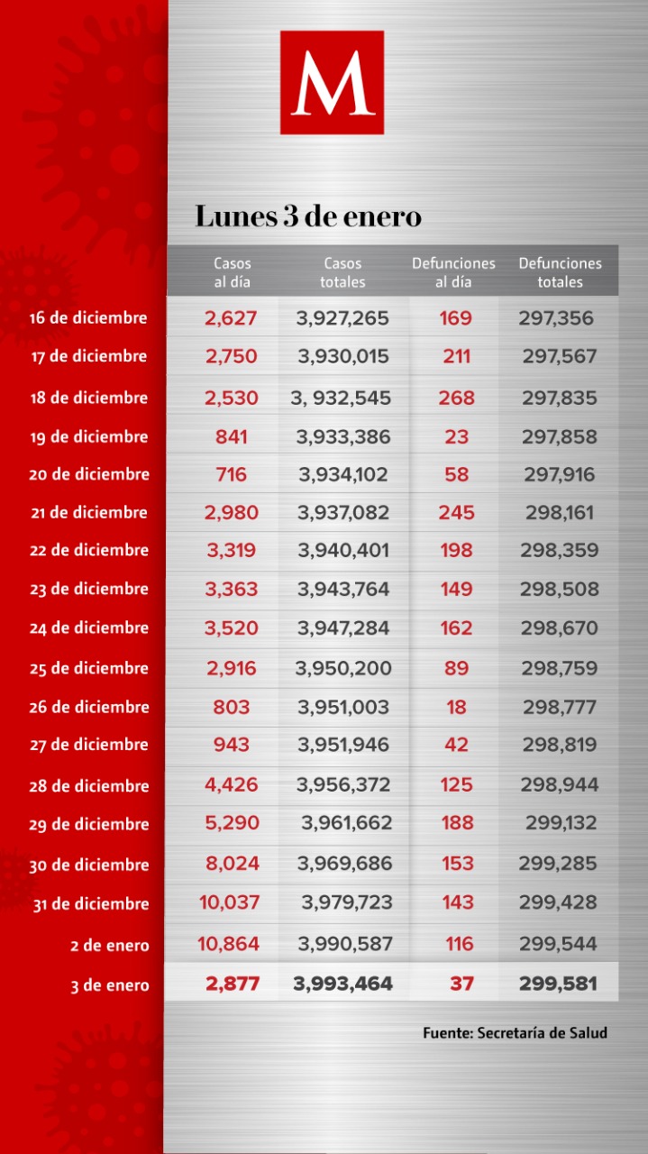 En las últimas 24 horas, México sumó 2 mil 877 nuevos casos de coronavirus y 37 muertes, con lo que se acumulan un total de 3 millones 993 mil 464 contagios y 299 mil 581 defunciones, de acuerdo con la Secretaría de Salud.