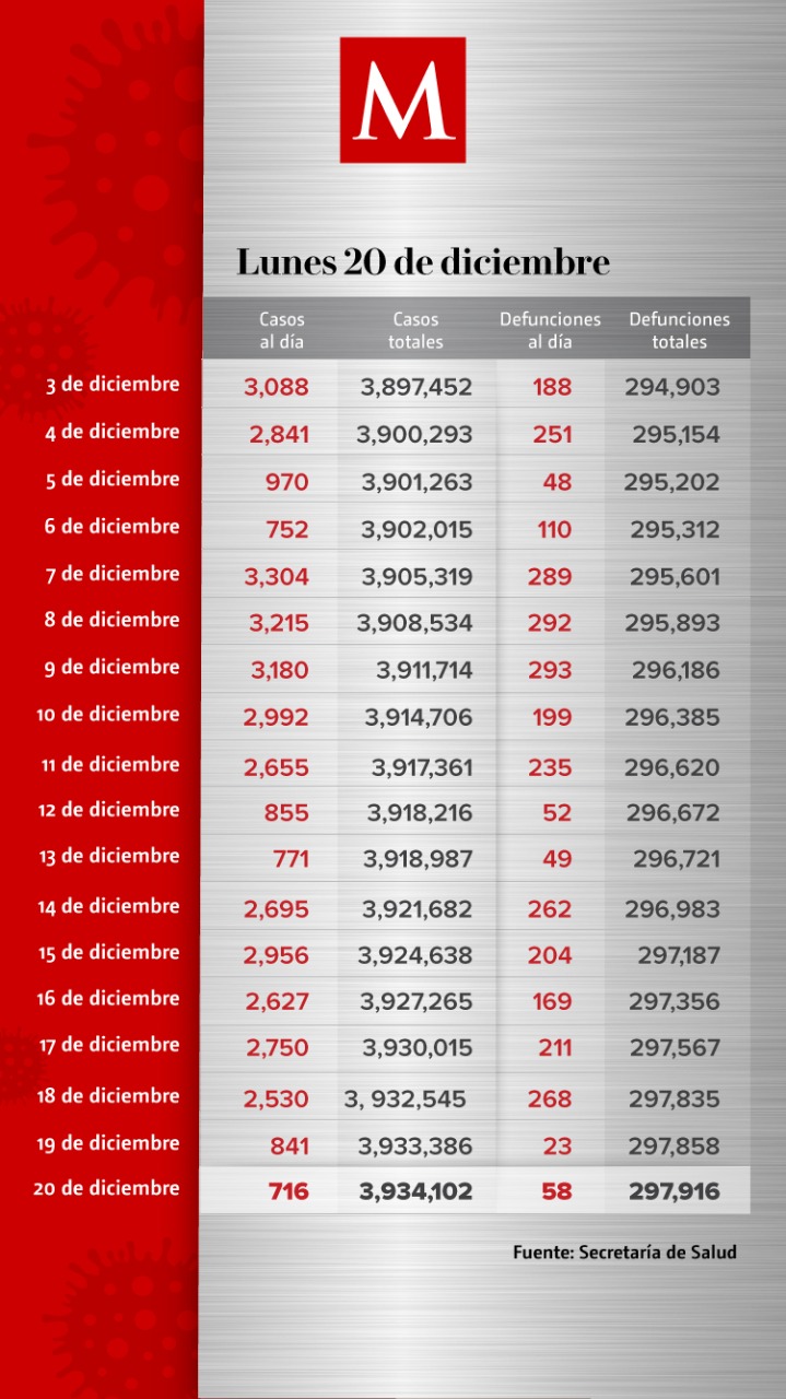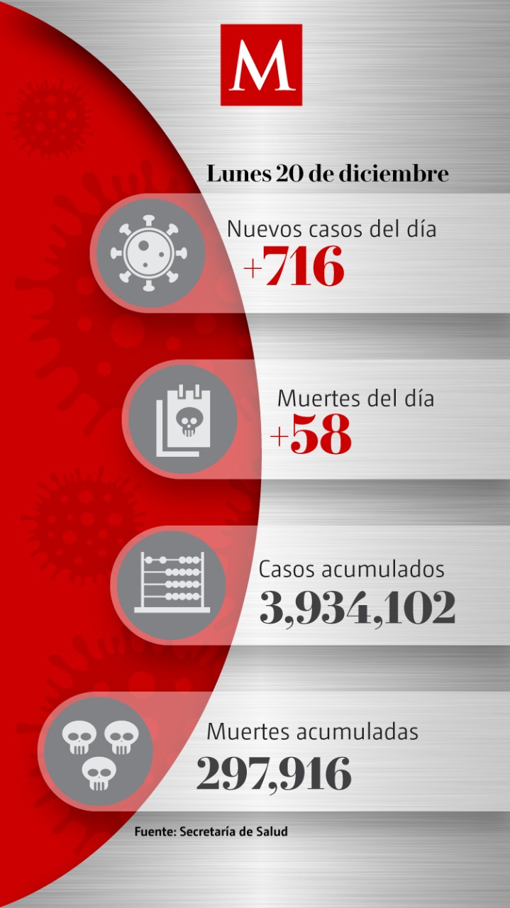 En las últimas 24 horas, México sumó 716 nuevos casos de coronavirus y 58 muertes, con lo que se acumulan 3 millones 934 mil 102 contagios y 297 mil 916 defunciones, de acuerdo con el informe de la Secretaría de Salud.