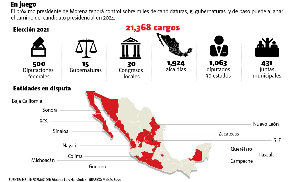 El próximo presidente de Morena tendrá control sobre miles de candidaturas en 2021: 15 gubernaturas que podrían dar a ese partido control político de la mitad del país y, de paso, allanar el camino al próximo candidato presidencial en 2024.