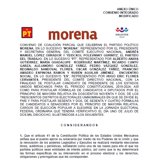 De igual manera, el mismo domicilio aparece en el convenio parcial de coalición entre Morena, Partido Encuentro Social y Partido del Trabajo que entregaron al INE, junto con el Registro Federal de Contribuyentes del primero: "MOR1408016D4".