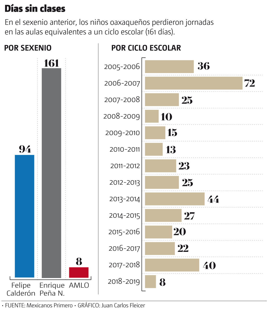 Durante el sexenio de Felipe Calderón, los 94 días que se perdieron representaron casi la mitad de un ciclo escolar. Esta cifra se duplicó durante la administración de Peña Nieto, ya que los estudiantes oaxaqueños perdieron casi el equivalente a un ciclo escolar (161 días).