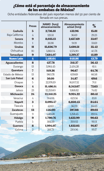 Según la autoridad federal, el grupo de los ocho estados por debajo de la mitad de llenado en sus presas está compuesto por: Coahuila, Baja California, Sonora, Morelos, Sinaloa, Chihuahua, Tamaulipas y Nuevo León.