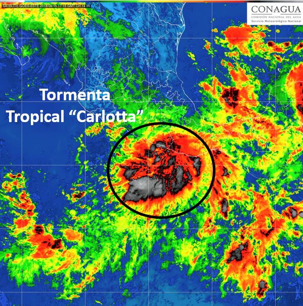 En noticias de estados, el Servicio Meteorológico Nacional informó que la tormenta tropical Carlotta se formó a 95 kilómetros al sur-sureste de Acapulco y a 95 kilómetros al oeste-suroeste de Punta Maldonado, ambas localidades en Guerrero.