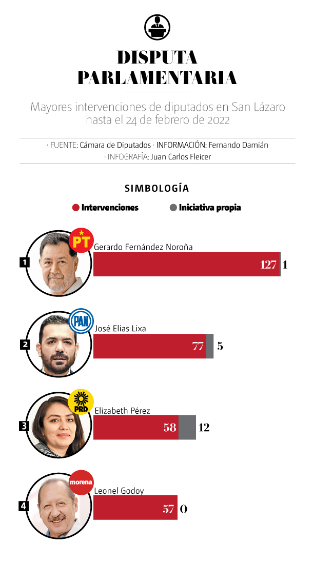 Como arietes de sus respectivas bancadas en la actual legislatura de la Cámara de Diputados destacan Gerardo Fernández Noroña, del PT, con 127 intervenciones en tribuna y desde su curul en el pleno; José Elías Lixa, del PAN, con 77; Elizabeth Pérez, del PRD, con 58; Leonel Godoy, de Morena, con 57, y Margarita García, del PT, con 46.