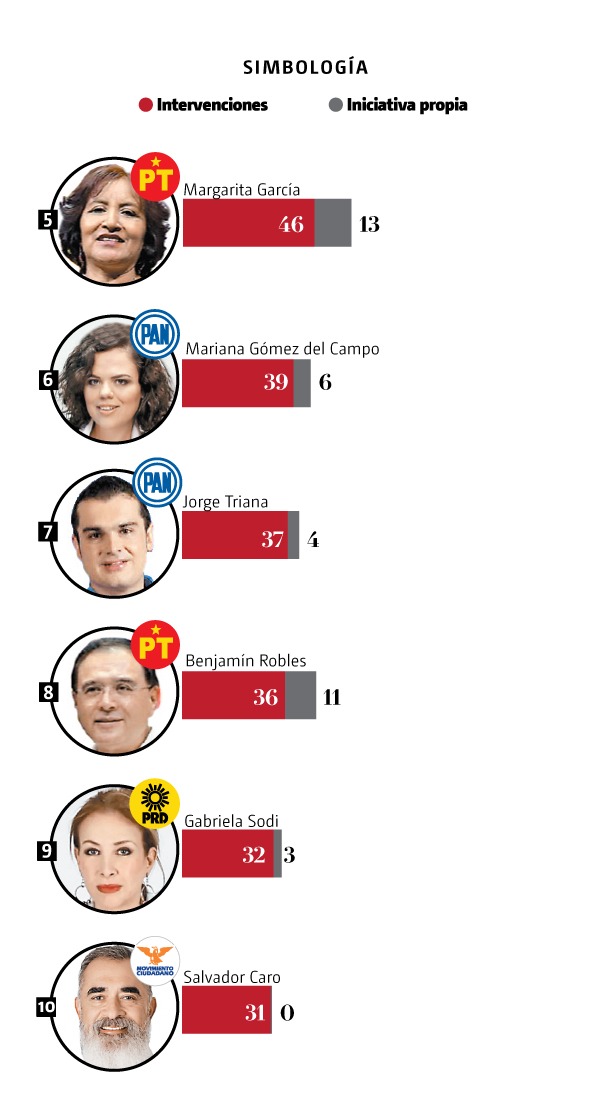 Por lo que hace a la participación de los líderes parlamentarios, el emecista Jorge Álvarez Máynez suma 28 intervenciones en tribuna y desde su curul en las sesiones del pleno, seguido por el panista Jorge Romero, con 14, y el perredista Luis Cházaro, con 13.