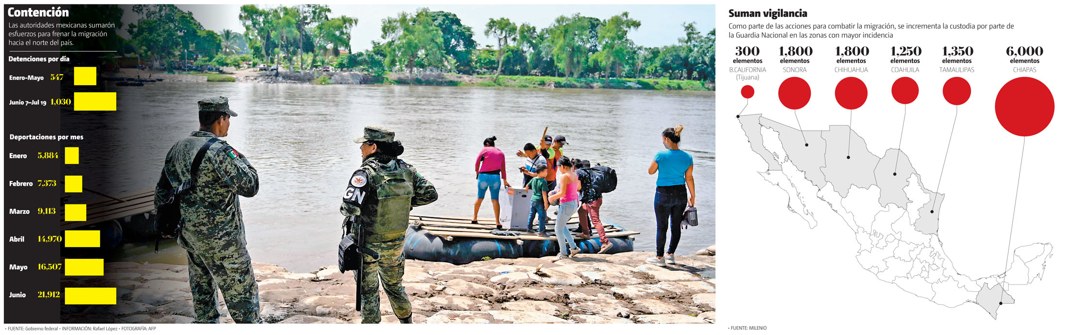 Posteriormente, el 24 de junio, la Secretaría de la Defensa Nacional señaló que envió a 20 mil militares para contener el paso de los migrantes en las fronteras, de los cuales 2 mil se hallan específicamente en los municipios que limitan con las fronteras de Belice y Guatemala, mientras que otros 4 mil 500 efectivos vigilan el sureste del país, entre el Istmo de Tehuantepec y la ruta ferroviaria que recorre La Bestia. Los 14 mil soldados restantes se dedican a cuestiones migratorias en comunidades del norte.