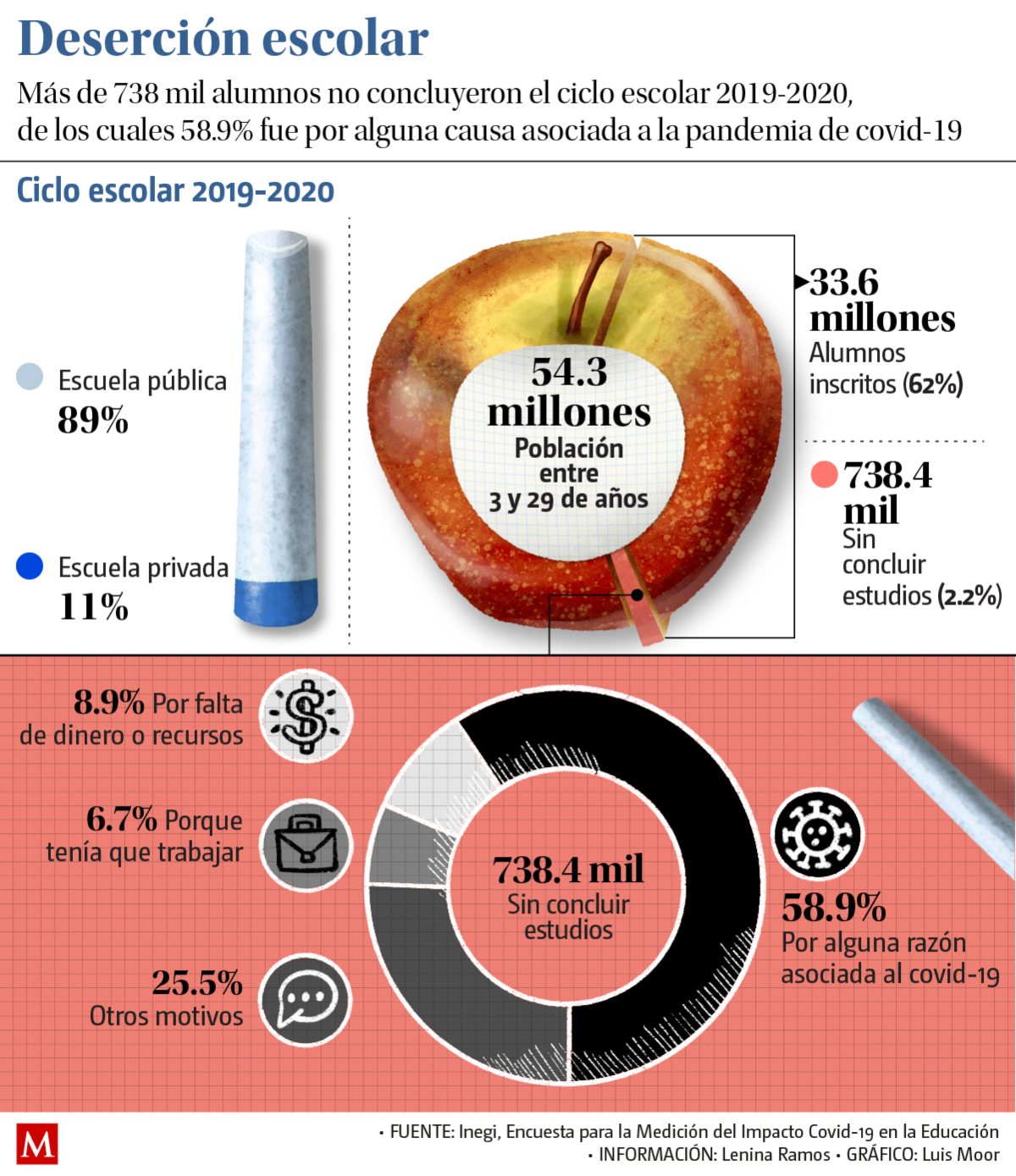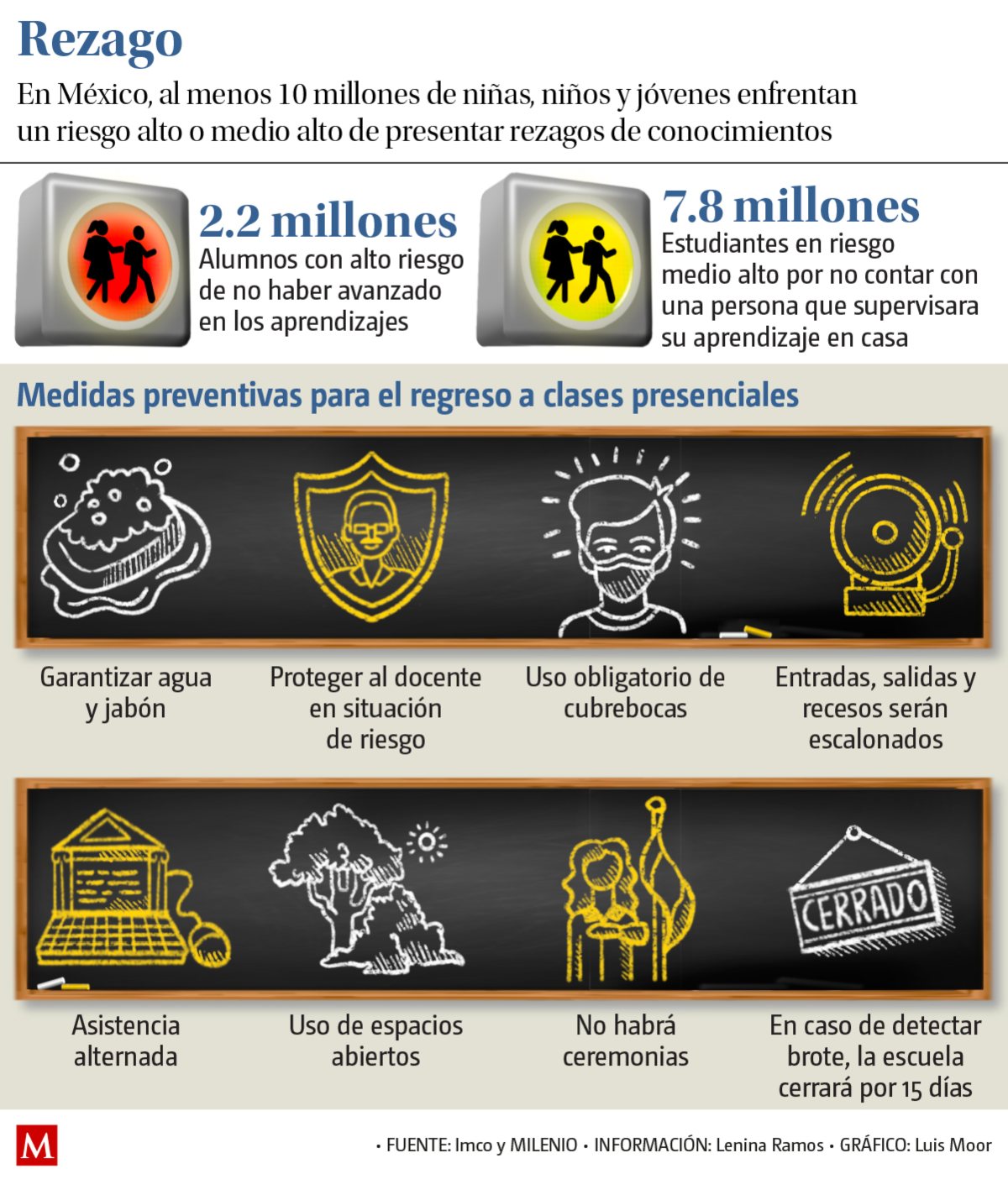 De acuerdo con un estudio del Instituto Mexicano para la Competitividad (IMCO), alrededor de 10 millones de estudiantes en el país tendrán un retraso de hasta dos grados escolares, por el cierre de escuelas a causa de la pandemia, mientras que la titular de la Secretaría de Educación Pública, Delfina Gómez, ha declarado que en el pasado ciclo escolar no hubo reprobados pues “la retención no nos llevaría más que a una alta probabilidad de abandono escolar, sería un terrible desincentivo”.
