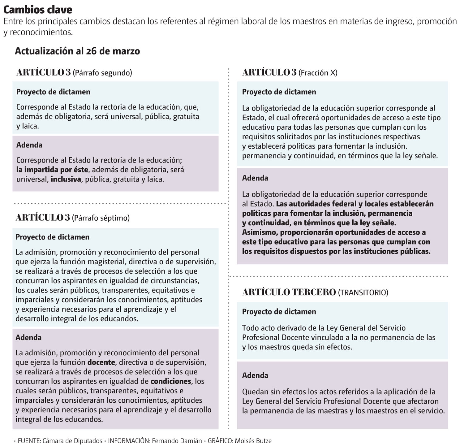 En tanto, el diputado Mario Delgado garantizó que el dictamen no contraviene sus derechos laborales. “No hay ningún agravio… Estamos ante la gran oportunidad de revertir la mal llamada reforma educativa”, refirió.