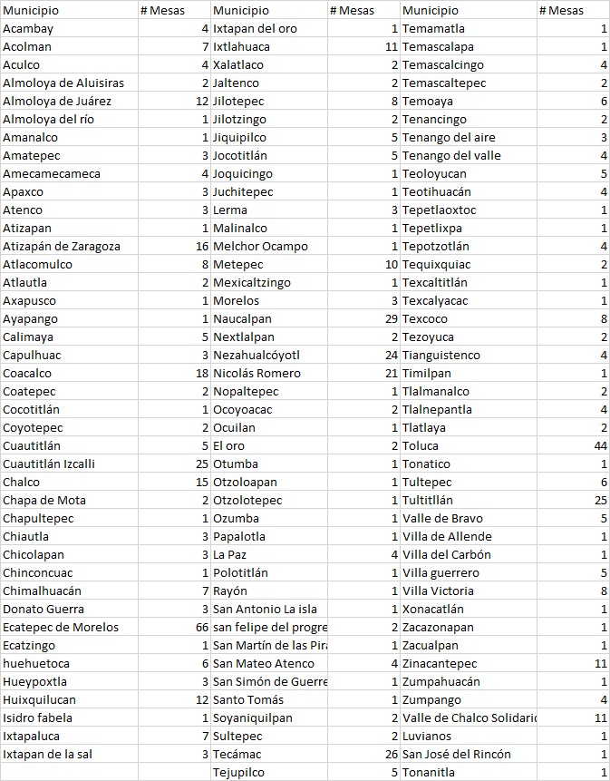 El municipio que tendrá más mesas de votación de acuerdo con el documento es Ecatepec, con 66; seguido de la capital mexiquense, Toluca, con 44; para que Naucalpan ocupara el tercer puesto con 29.