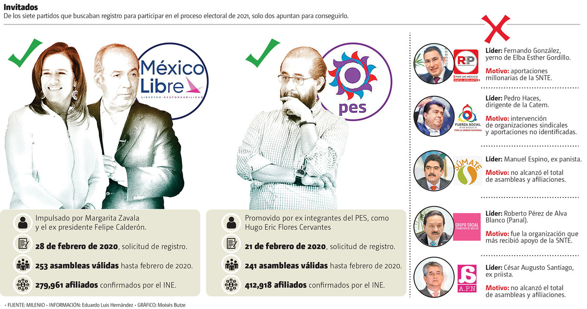 La Comisión de Prerrogativas y Partidos Políticos del INE dio luz verde ayer para que México Libre y Encuentro Solidario obtengan su registro y figuren en las boletas en la elección federal de 2021 y dejó en vilo a Redes Sociales Progresistas —vinculado a la ex lideresa del magisterio Elba Esther Gordillo— y a Fuerza Social, del líder sindical Pedro Haces.