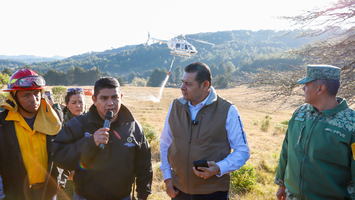 Gobernador de Puebla sobrevuela incendio en Sierra Negra; está controlado al 70%