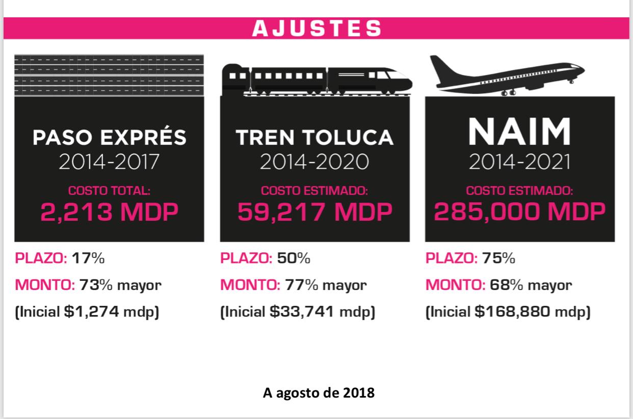 La falta de una buena planeación ha generado sobrecostos en la construcción de las obras más importantes de este sexenio: el Nuevo Aeropuerto Internacional de México (NAIM) registró hasta agosto de este año un costo adicional de 68%, el Tren Toluca, 77%, y el Paso Express 73% más del total de recursos proyectados para su construcción.