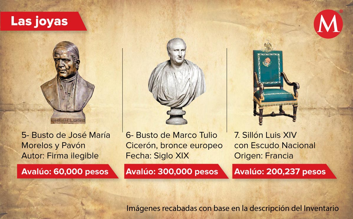 En el inventario destacan las imágenes del primer presidente constitucional de México, Guadalupe Victoria; del dictador vitalicio con el tratamiento de Alteza Serenísima, Antonio López de Santa Anna; del mandatario con más años al frente del país, Porfirio Díaz.