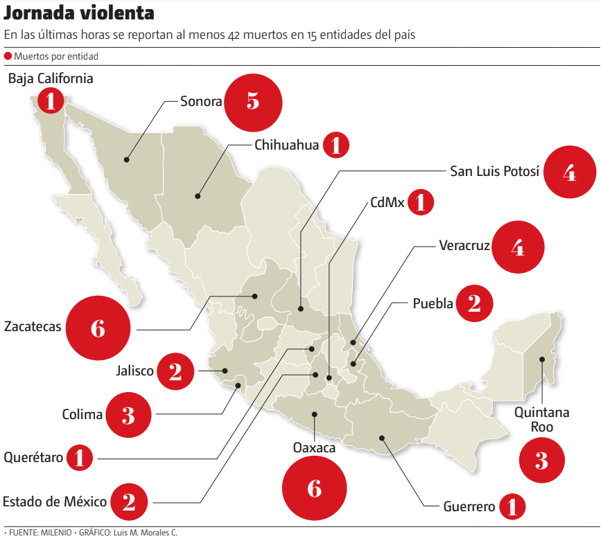 En las últimas horas, al menos 42 personas fueron asesinadas en 15 estados, incluido Quintana Roo, que cerró la jornada del viernes con tres muertos, dos en Cancún y uno en Playa del Carmen; mientras que en Oaxaca, la fiscalía reportó el asesinato de seis personas, entre ellas un ex policía municipal de 30 años, en Juchitán de Zaragoza.