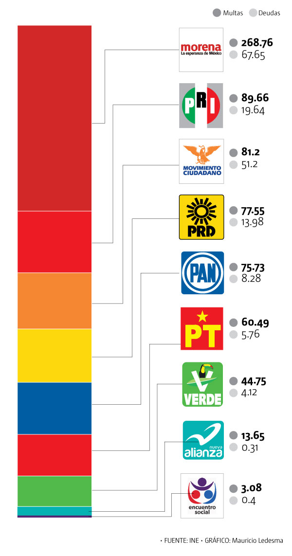 El INE sancionará a los partidos con más de 714.9 millones de pesos por las irregularidades que tuvieron en su gasto ordinario de 2018, de los cuales la tercera parte —268 millones— corresponde a Morena.